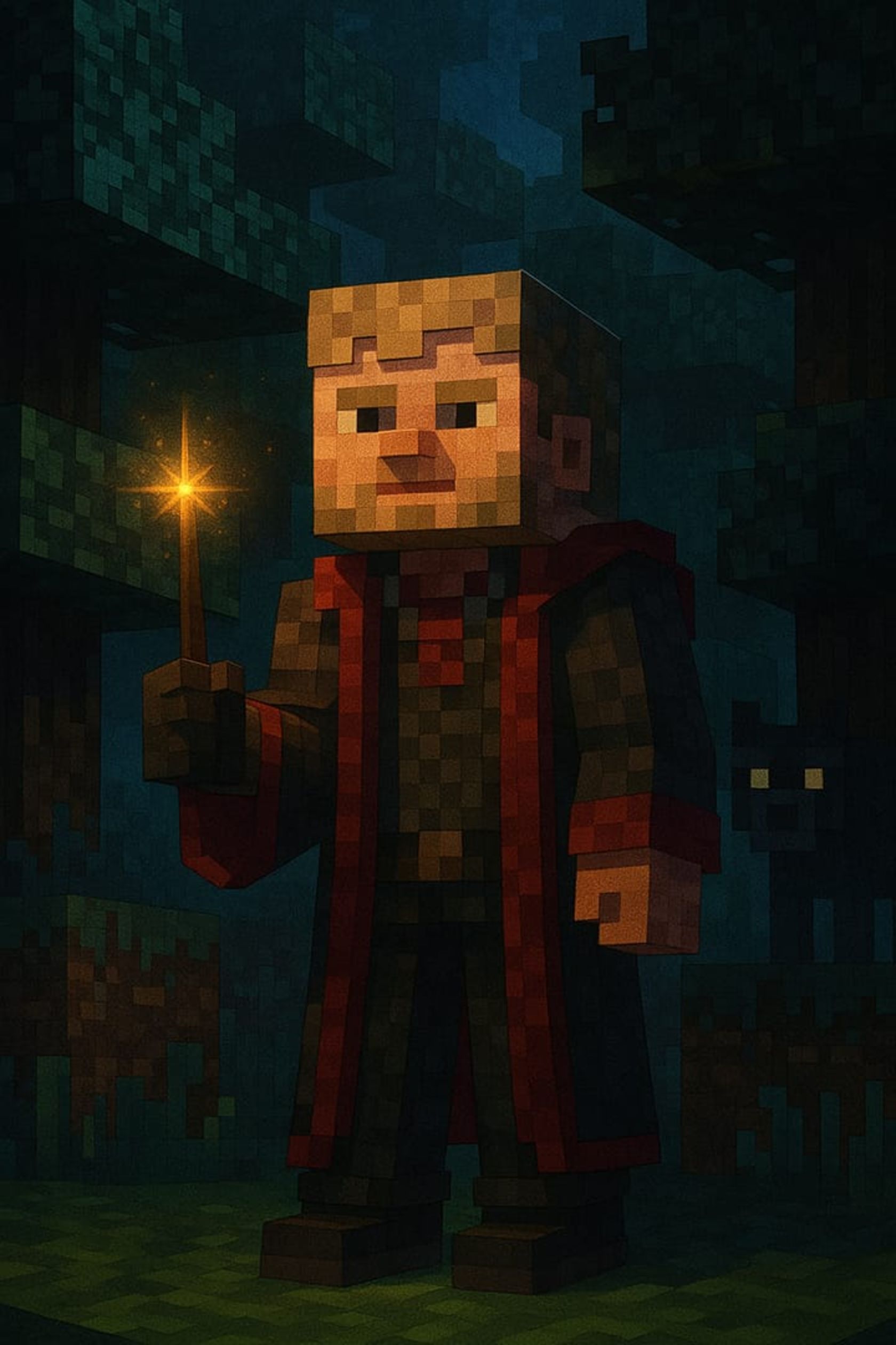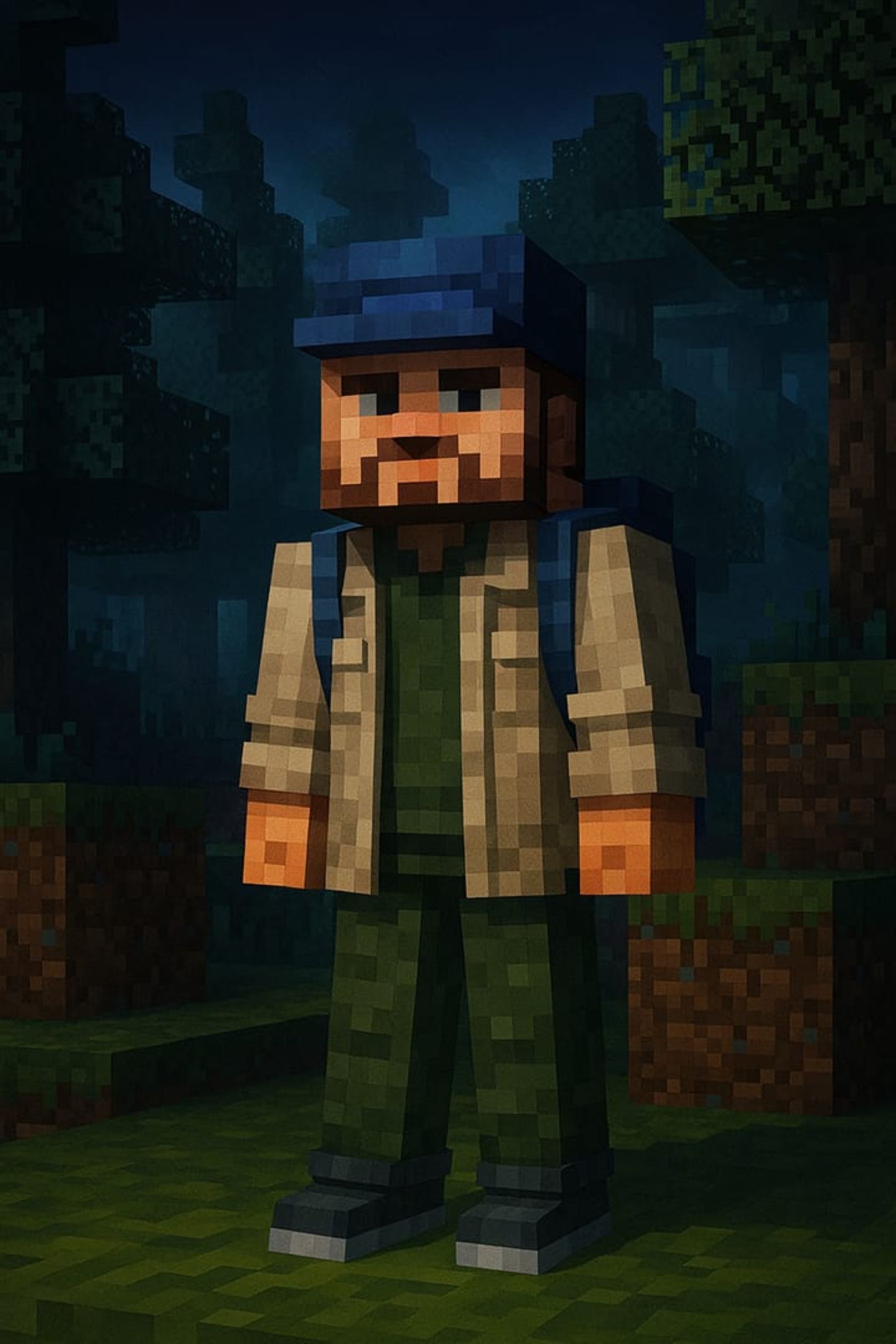 این تصویر را به حالت ماینکرفت تبدیل کن. شخصیت حاضر در تصویر باید به شخصی با زیباییشناسی معمول، بلوکمحور و پیکسلی سری ماینکرفت تبدیل شود. این شخص را در فضای جنگل تاریکی قرار بده که همسو با طراحی هنری بازی باشد و شامل درختهای مربعی، برگهای پیکسلی، زمینهای بلوکمانند و سایههای مخوف باشد.