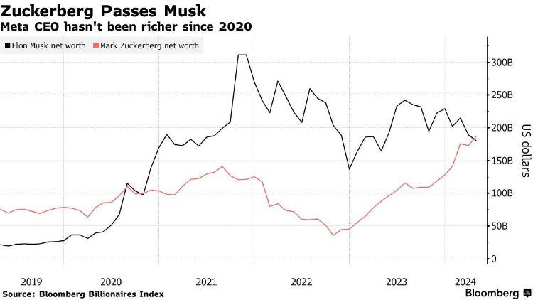 پس از انتشار خبری که نشان میداد تحویل خودروهای تسلا در سهماههی اول ۲۰۲۴ برای اولینبار از دوران همهگیری کرونا درمقایسهبا سال قبل کاهش یافته است، شاهد عبور زاکربرگ از ماسک در فهرست ثروتمندترین افراد جهان بودیم.