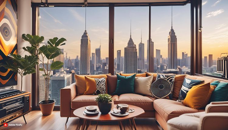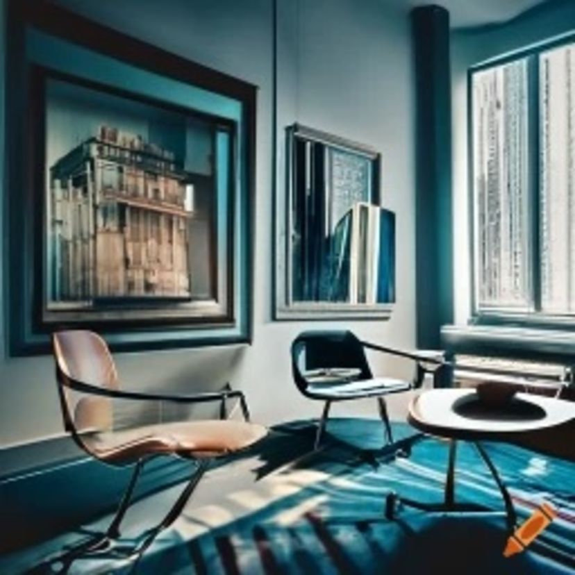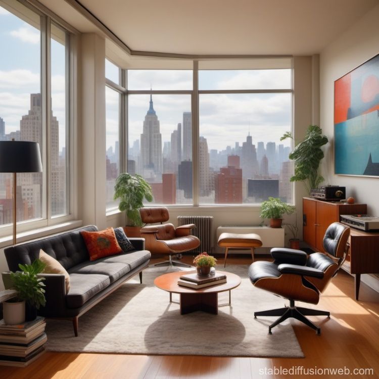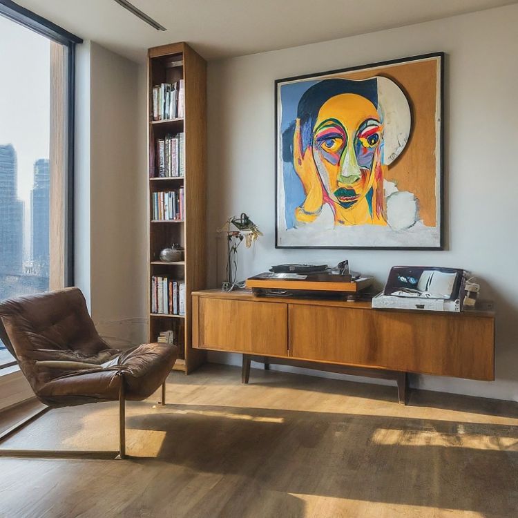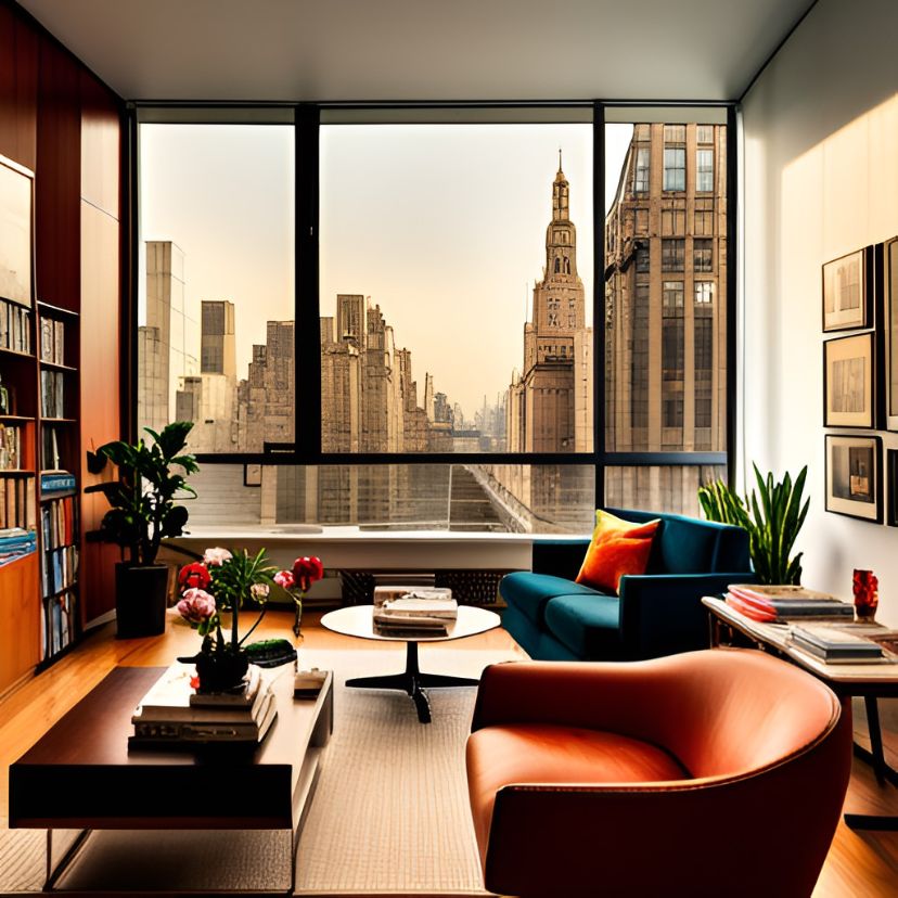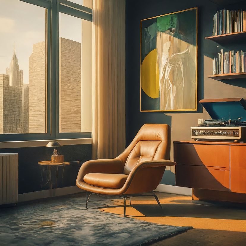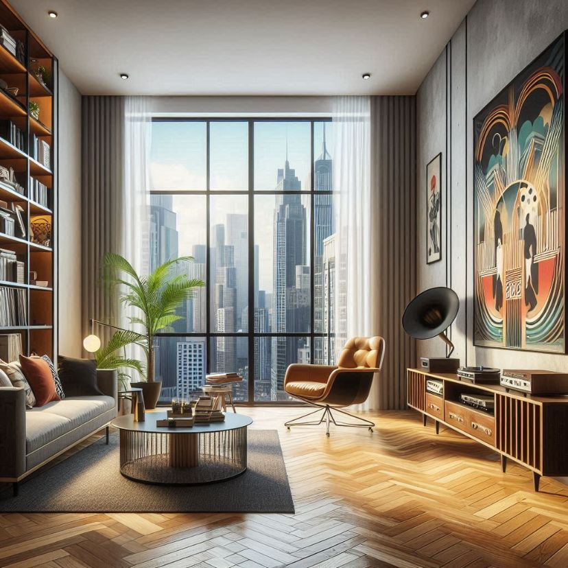 اتاق نشیمن مدرن داخل یک آپارتمان در شهری بزرگ در هنگام بعد از ظهر. این اتاق پنجرههای بزرگ کشیده داشته باشد و روی دیوار، تابلوی نقاشی با سبک Art Deco نصب شده باشد و یک پلیر موسیقی، صندلی راحتی و قفسهی کوچکی از کتاب در این اتاق وجود داشته باشند.