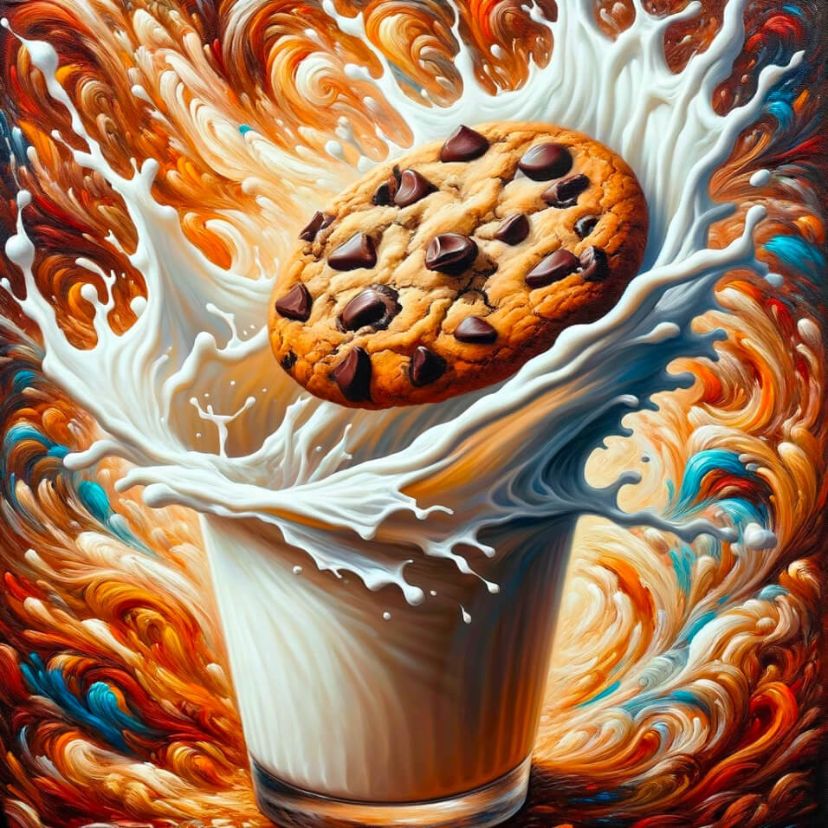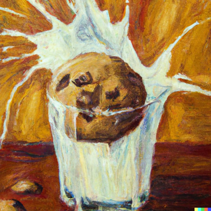 در تصاویر زیر، مقایسهای میان DALL•E 2 و DALL•E 3 انجام شده است. به هر دو نسخه این توصیف متنی داده شده است: «یک نقاشی روغنی از یک کلوچهی شکلاتی که در یک لیوان شیر فرو میرود و انفجاری از طعمها نشان داده میشود.»