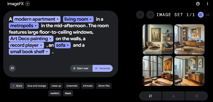 ابزار تولید تصویر ImageFX از مدل زبانی بزرگ Imagen 2 گوگل برای تبدیل متن به عکس قدرت میگیرد. این ابزار توانایی بسیار جذابی در راهنماییکردن کاربر برای نوشتن بهترین درخواست دارد. به عنوان مثال، کلیدواژههای مهم داخل درخواست متنی را استخراج و برای هرکدام چند گزینه پیشنهاد میدهد تا آن را ویرایش و بهینه کند (مانند تصویر زیر).