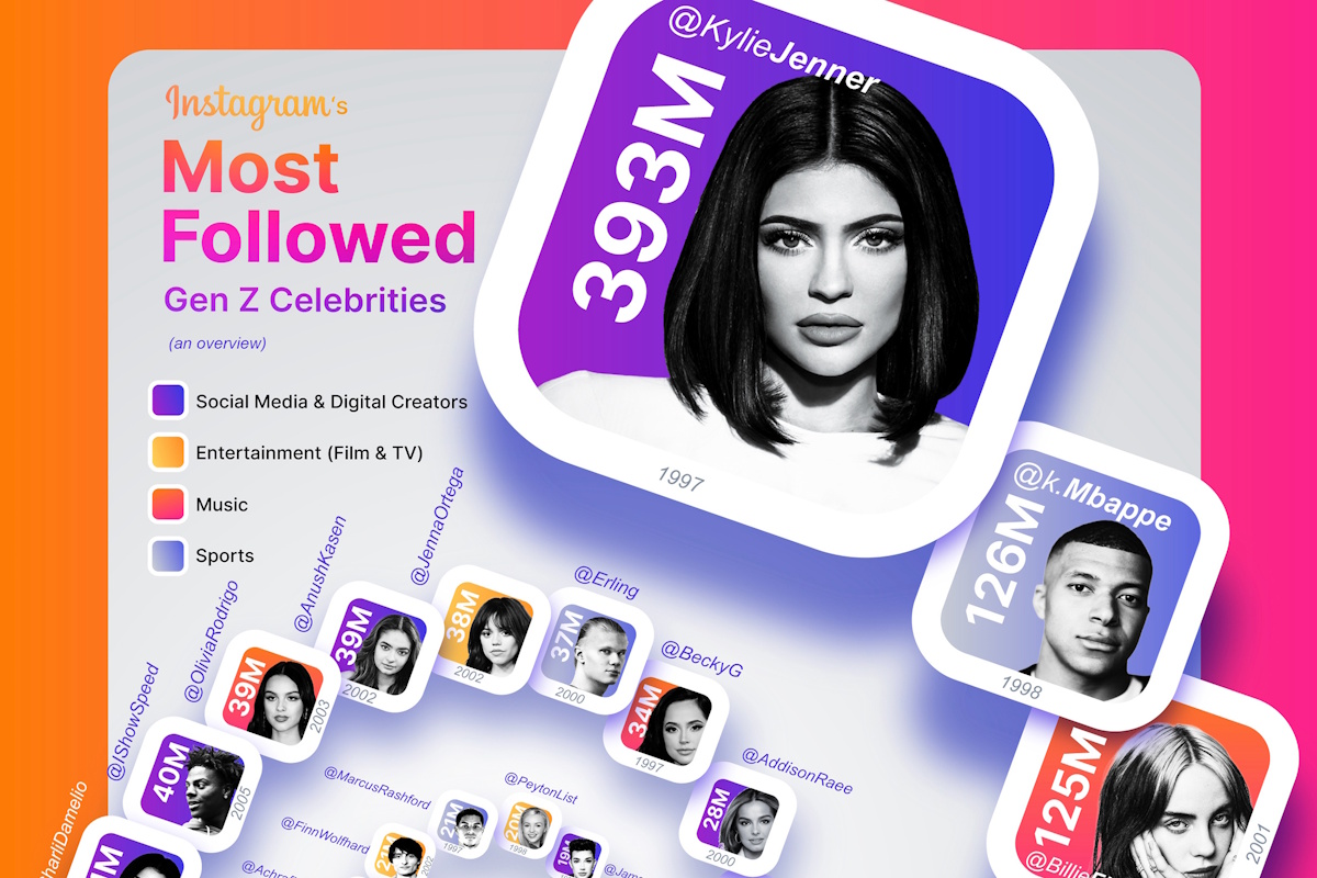 - کایلی جنر با ۳۹۳ میلیون دنبالکننده در صدر فهرست قرار دارد و پرطرفدارترین سلبریتی نسل Z در اینستاگرام است.