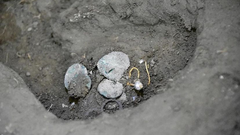 اسکلت زن روی تخت پیدا شد و در دستان او گنجینه کوچکی از سکههای طلا، نقره و برنز و همچنین گوشوارههای طلا و مروارید دیده میشود.