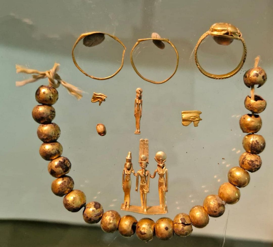 همچنین مهرههای متعدد، برخی از آنها با روکش طلا، که مربوط به آغاز سلسله بیست و ششم مصر باستان هستند از داخل کوزه به دست آمده است.